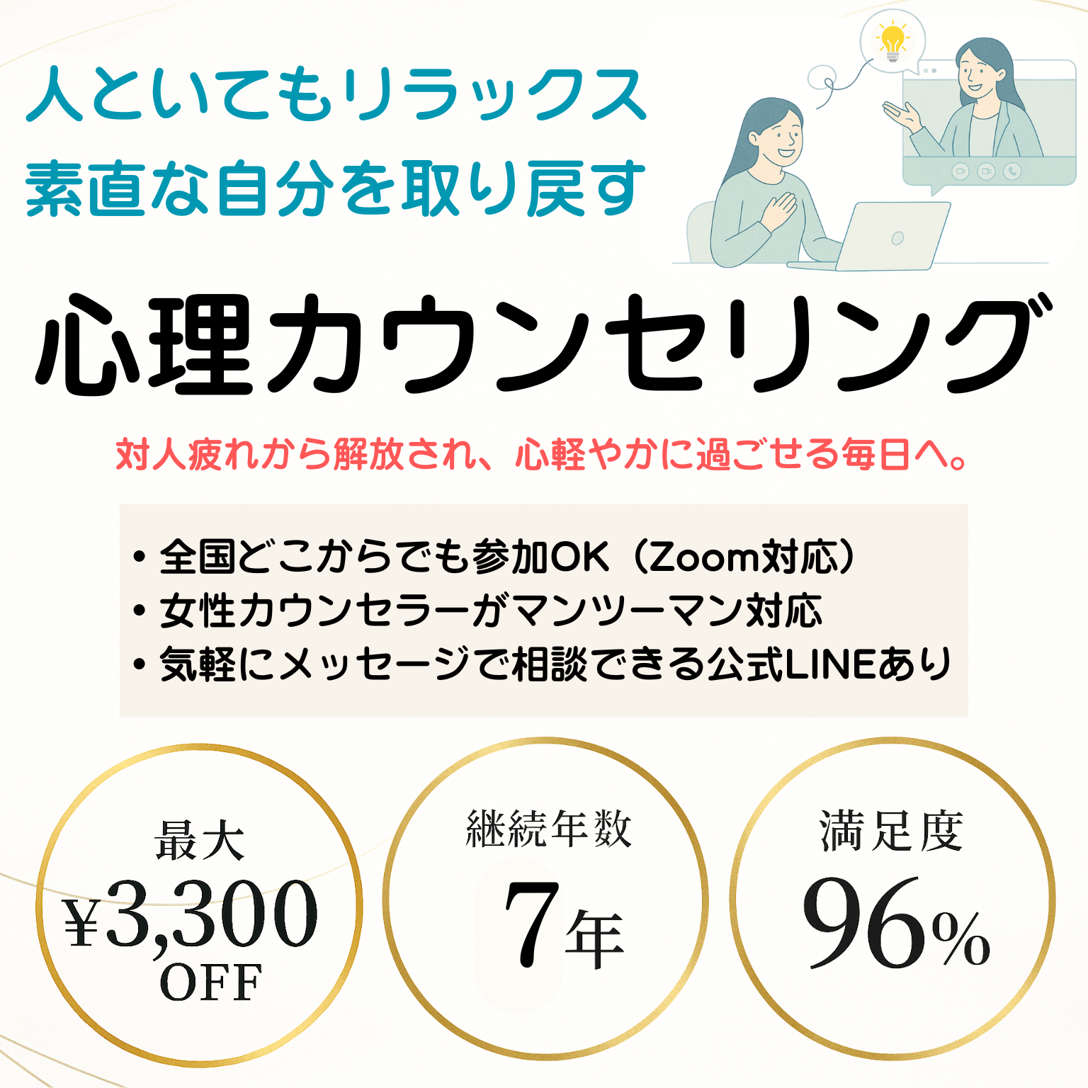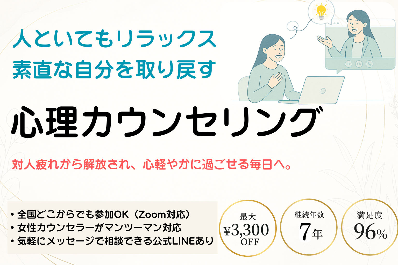 30分カウンセリング※初利用の方限定!■おすすめの方お悩みを誰かに聞いて欲しい人当サービスが自分に合うか試したい人■参加方法公式LINEにて受付中!■料金・キャンペーンLINE登録後3日間お試し価格2,000円で相談可能!